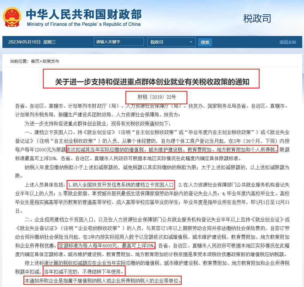2019年財(cái)稅發(fā)文《關(guān)于進(jìn)一步支持和促進(jìn)重點(diǎn)群體創(chuàng)業(yè)就業(yè)有關(guān)稅收政策的通知》。