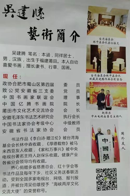 吳建騰,現(xiàn)為中國億騰書畫院院長、中國書法家協(xié)會中級教師、莆田市文化藝術(shù)交流協(xié)會會長、安徽省書法家協(xié)會會員,熱衷文化交流推廣與慈善公益事業(yè)。