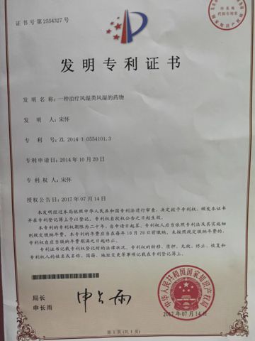 從此我的名聲越來越大,越傳越遠(yuǎn)。二十幾年的時(shí)間,風(fēng)濕和類風(fēng)濕的病治療很多,而且效果很好。2014年我申請(qǐng)了專利,2017年獲得國家知識(shí)產(chǎn)權(quán)局頒發(fā)的《發(fā)明專利證書》,生產(chǎn)消字號(hào)“風(fēng)毒液”。2018年,由陜西中燁藥業(yè)有限公司備案為械備字號(hào)“筋骨冷敷凝膠”,并簽訂產(chǎn)品質(zhì)量保證協(xié)議書,投入生產(chǎn)。