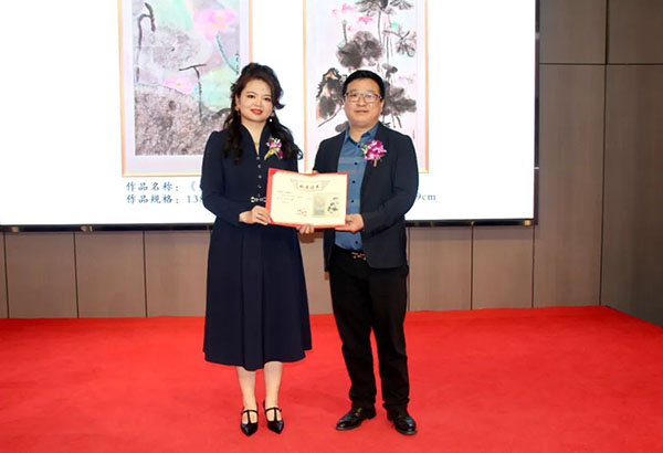 參展作者馬米娜向甘肅省藝術(shù)館捐贈(zèng)美術(shù)作品(右 甘肅省藝術(shù)館館長 關(guān)成根)