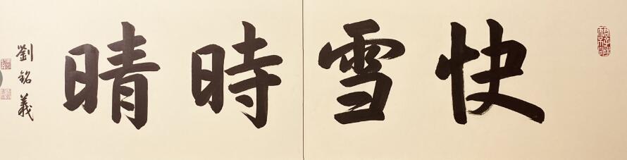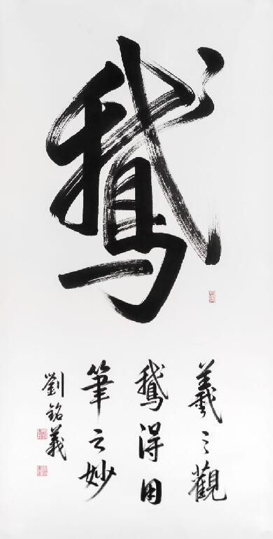 劉銘義將所悟出的王羲之筆法與中國社會(huì)科學(xué)院王鈞先生探討,王鈞先生對(duì)劉銘義所言王羲之運(yùn)指筆法頗感興趣,隨提出“古今未見二王書風(fēng)大字,你能書寫嗎”,劉銘義按王先生的提議,用悟出的王羲之筆法在各種紙上嘗試書寫王羲之書風(fēng)大字,成功地將二王書風(fēng)大字在生宣、熟宣及各種紙上再現(xiàn)出來。劉銘義在生宣紙上書寫50cm的二王書風(fēng)大字,展示給王鈞先生,得到了王先生的高度評(píng)價(jià)。王鈞先生說:“劉銘義是我見到的最純粹的書法藝術(shù)家,他一心追求完美的書法藝術(shù),探索二王書法真諦,提出了二王書是手指運(yùn)筆這一重要特點(diǎn),他再現(xiàn)了二王書法的精華,形成了以靜為動(dòng)超然物外的藝術(shù)風(fēng)格”。劉銘義研究的王羲之書法用筆也得到了日本各界人士的關(guān)注。