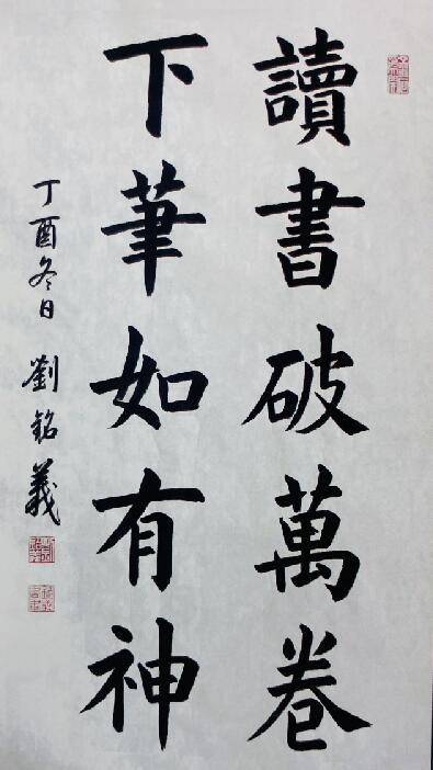 劉銘義在研習(xí)書法的過程中,將自己的實(shí)踐經(jīng)驗(yàn)與古人書法理論相結(jié)合,對(duì)書法有自己的獨(dú)到見解:(1)他認(rèn)為書法重在使轉(zhuǎn),轉(zhuǎn)折處過方則鋒露、呆板;過圓則脫節(jié)、無力,轉(zhuǎn)折應(yīng)內(nèi)方外圓提按鋒藏于點(diǎn)畫中。