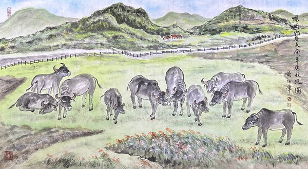 牛販之子、蔡俊章博士于2023年10月21日晨,完成水墨《陽明山擎天崗草原放牧圖》+《十牛圖頌》創(chuàng)作。