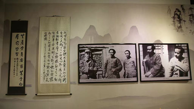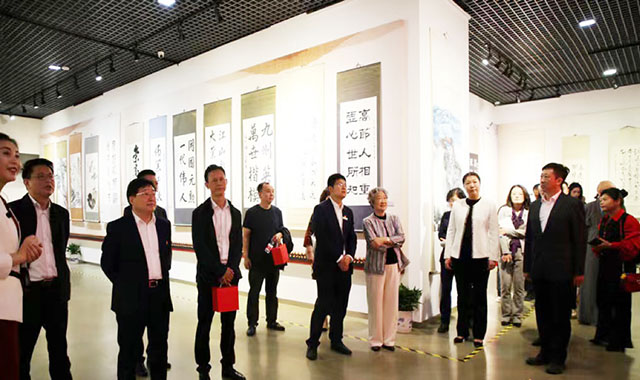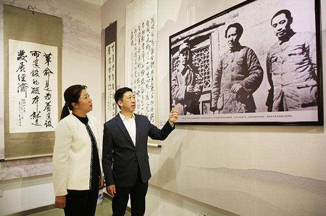任弼時(shí)同志嫡孫任繼寧、孫媳李萌和嘉賓在書畫展現(xiàn)場。
