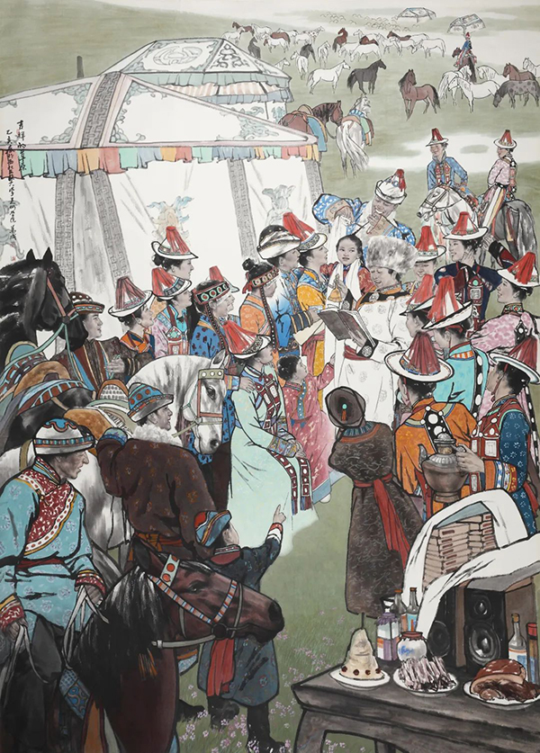 王萬成多少年都秉持著平等的身份、平和的心態(tài)、平視的眼光全身心地擁抱對象,才有了如鯁在喉、不吐不快的創(chuàng)作沖動,也是他數(shù)十年樂于不避反復(fù)地演釋藏族繪畫主題并且取得驕人業(yè)績的緣由所在。正是心靈契合、情感與想象、創(chuàng)造的疊加效應(yīng),才是成就了萬成筆下如《曙光》《雪域歡歌》《風和》《朝圣路上》等一系列優(yōu)秀大型人物畫作品的必然動因。創(chuàng)作于2019年的水墨人物畫《鈴聲搖響豐收歌》是入選第十三屆全國美術(shù)作品展覽的優(yōu)秀獲獎作品,他采用中西兼容的線條勾勒和多遍膚色罩染,使人物形象栩栩如生、質(zhì)樸而富有生氣,使其作品強化了畫面的形式張力,突顯了繪畫藝術(shù)禮贊生命之雋永、吟誦精神之高華的內(nèi)涵容量。