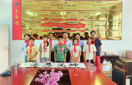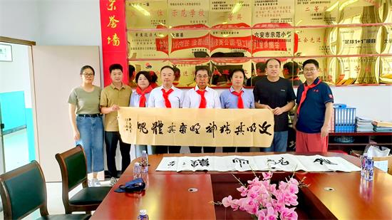 活動期間,老兵潘磊與諸位藝術(shù)家一行與校方進行了友好溝通,并與學(xué)生進行了互動,互動期間學(xué)生為到場所有人員佩戴了紅領(lǐng)巾,藝術(shù)家們?yōu)樾7劫浰土斯膭顚W(xué)好文化課等內(nèi)容的書法作品。