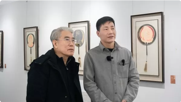 王文濤(右)在展覽現(xiàn)場與中華詩詞協(xié)會詩教部副主任李建春交流