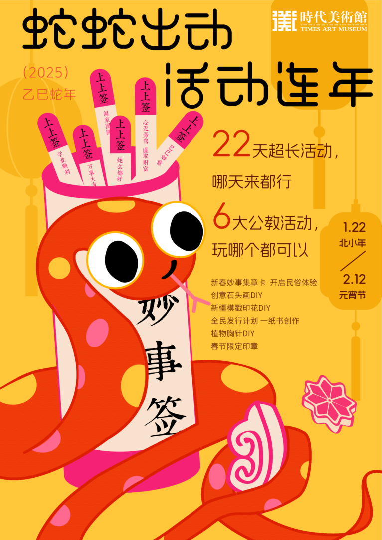 春節(jié)期間,北京時代美術(shù)館通過藝術(shù)詮釋傳統(tǒng)年俗。觀眾入館即可領(lǐng)取妙事體驗卡,開啟華熙國際集團(tuán)打造的民俗之旅。沿指定路線集章打卡,有機(jī)會贏取新春好禮。在許愿墻許下心愿,寄托新年期望。此外,在小紅書上@北京時代美術(shù)館,可參與抽取“好運(yùn)上上簽”,獎品豐富,包括美術(shù)館限定花瓶、展覽周邊禮等,中獎率百分之百?;顒悠陂g,蛇年限定版印章更是為很多觀眾留下了獨(dú)特的新年記憶。
