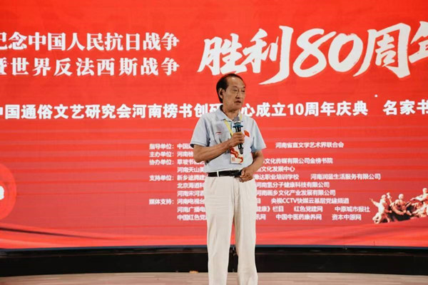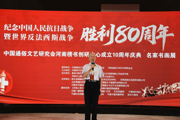 中國通俗文藝研究會榜書委員會副會長,河南榜書創(chuàng)研中心主任李存立先生致辭,首先向各位領(lǐng)導、嘉賓以及藝術(shù)家們的到來表示親切的問候真摯的感謝,重點闡述了這次舉辦紀念抗日戰(zhàn)爭暨世界反法西斯戰(zhàn)爭勝利80周年的重大意義,回顧了河南榜書創(chuàng)研中心十年來的發(fā)展歷程,始終堅持以人民為中心的創(chuàng)作導向,致力于傳承和弘揚中華優(yōu)秀傳統(tǒng)文化,在推動榜書藝術(shù)發(fā)展和公益事業(yè)方面做出的重大貢獻。